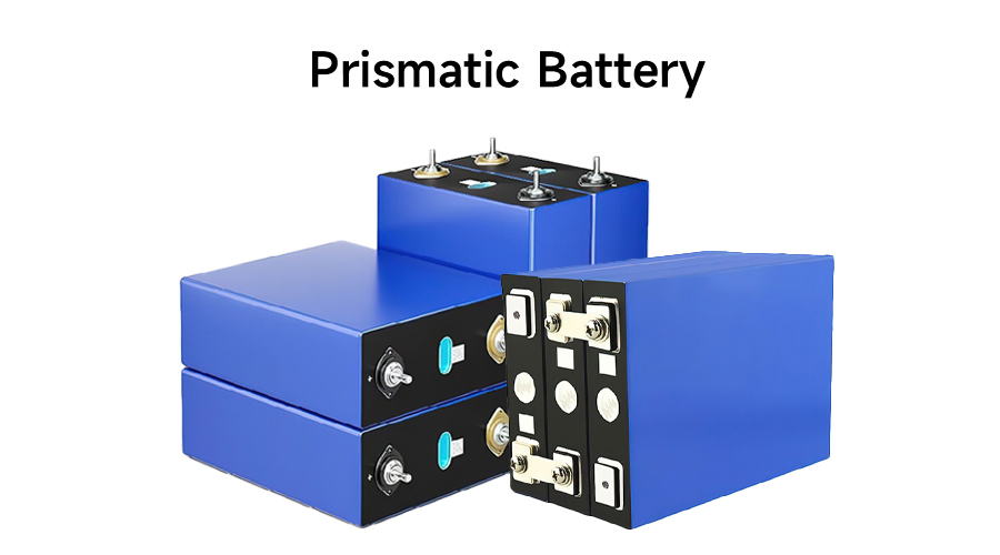 The prismatic battery features a rectangular aluminum or steel casing, designed to house large electrodes that are either stacked or folded into a flat shape.